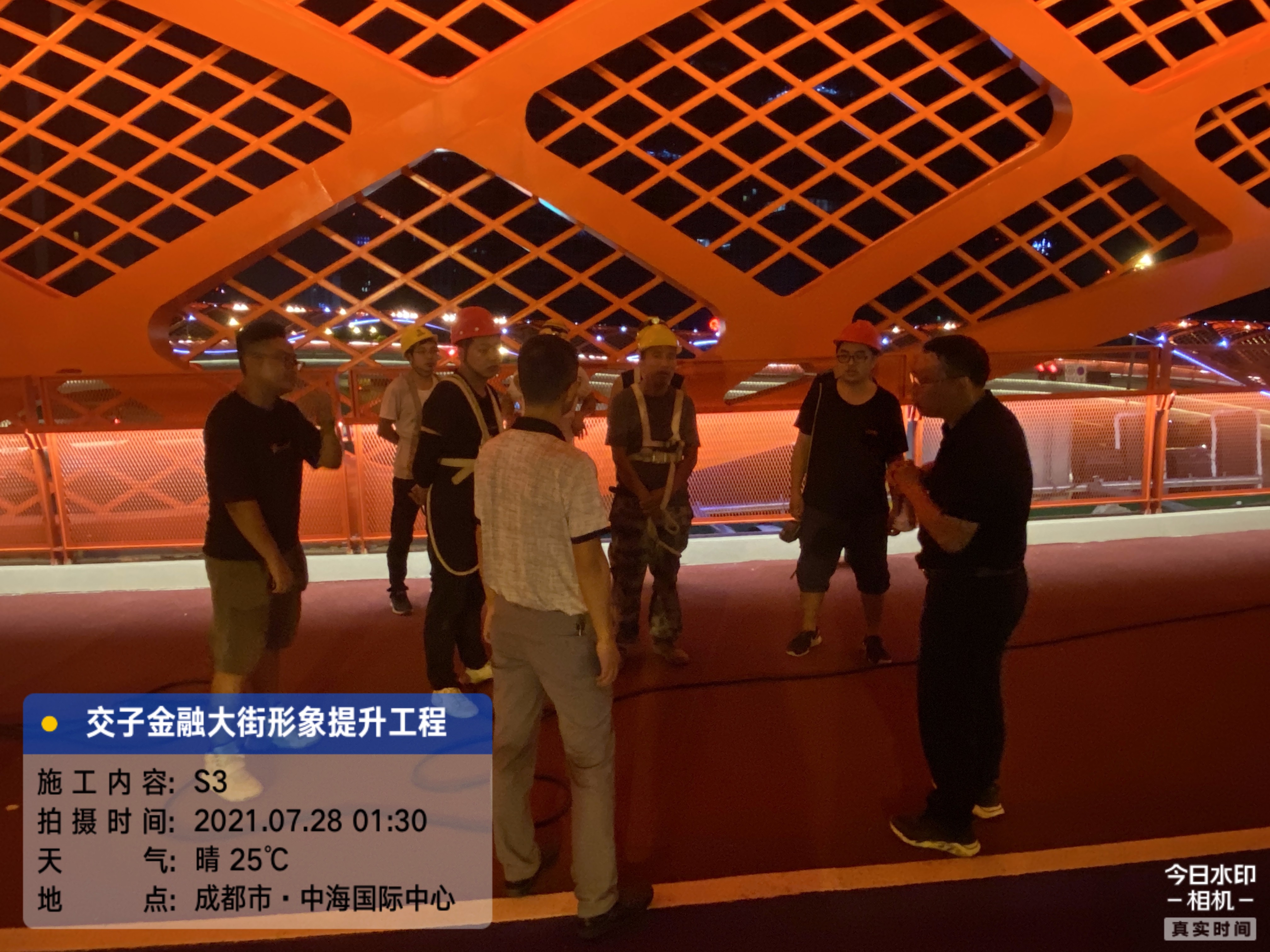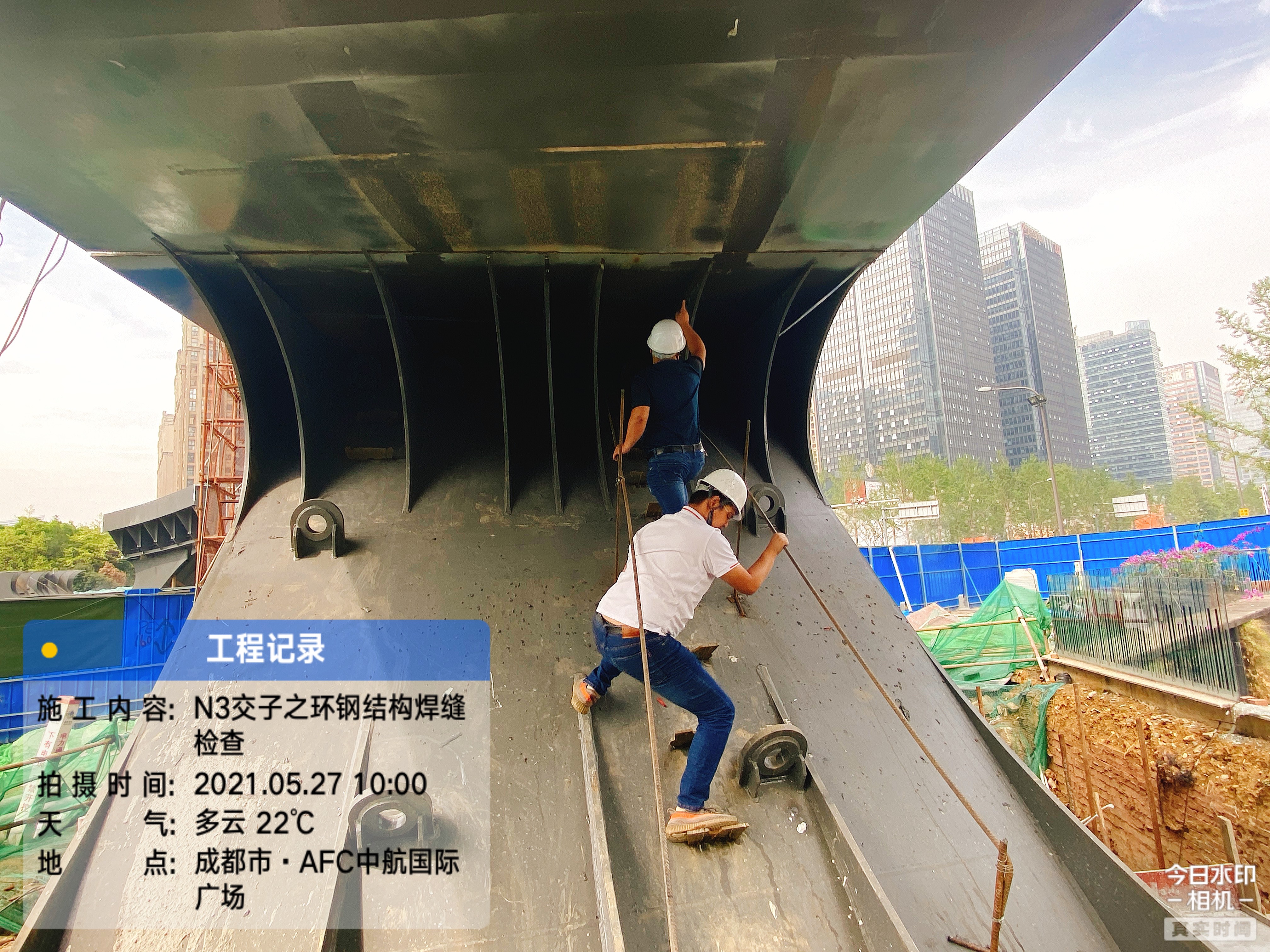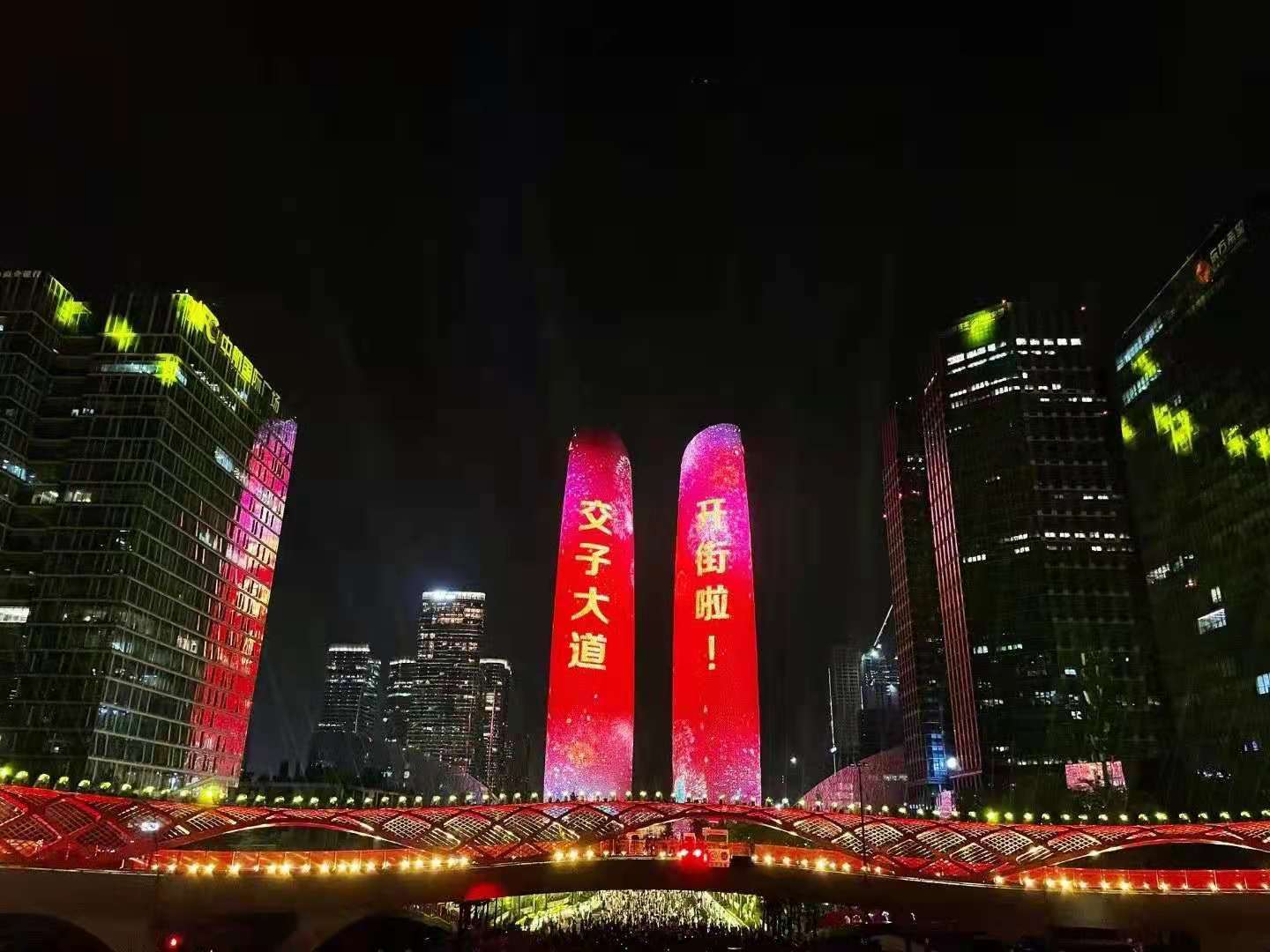 交子之環(huán)大橋內(nèi)直徑達(dá)96米,外直徑達(dá)114米,鋼結(jié)構(gòu),總重量達(dá)3274噸,集通行、休閑、商業(yè)等多功能為一體的多元場景的人行天橋。在施工過程中采用了三維數(shù)字模型、焊接機(jī)器人仿真模擬焊接等新工藝,加大了監(jiān)督管理的難度。